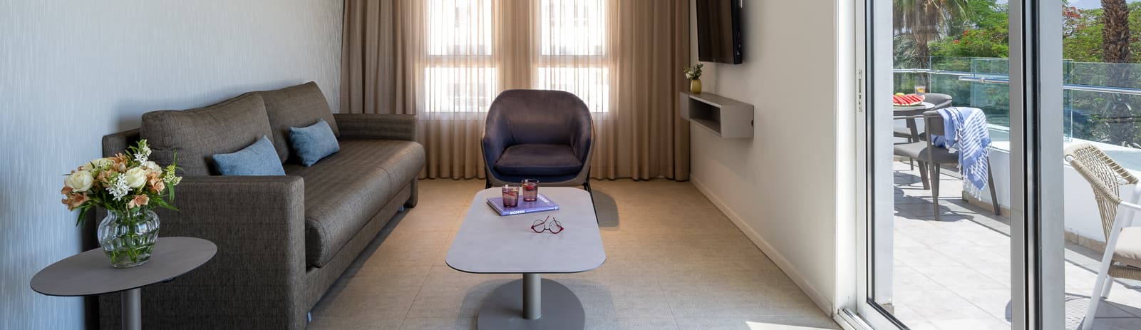 סוויטה מעוצבת וענקית, לחופשה מאושרת עם המשפחה או קבוצת חברים. היא כוללת 2 חדרי שינה מרווחים עם מיטות זוגיות גדולות ונוחות, סלון גדול עם ספה נפתחת, מרפסת גדולה עם נוף למי הבריכה הכחולים וחדר רחצה מפנק.